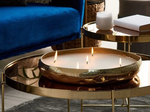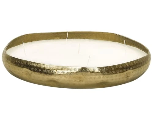 Bol bougie déco d’inspiration orientale en aluminium doré. Décorez n’importe quelle surface avec ce magnifique bougie bol d’inspiration orientale. Il complète parfaitement les intérieurs au style moderne, vintage et glamour grâce à son design élégant et sa finition dorée. Ce bougeoir original est fait en aluminium léger, rempli de paraffine qui diffuse un arôme délicat de vanille dans votre chambre ou salon. Créez une atmosphère romantique dans votre maison et profitez de la lumière douce et pleine de charme de cet accessoire déco très original.Détails: Type de produit: Bougie Style: Glamour Couleur principale: Doré Matière principale: Aluminium Finition: Peint Fabriqué à la main: Oui Dimensions: Profondeur: 37 cm Largeur: 37 cm Hauteur: 6 cm Poids: 3 kg L`offre inclue: 1 x Bougie Caractéristiques clés: Fabriqué à la main avec le plus grand soin, Décoratif et fonctionnel, Style chic, Un style simple s’adaptant à tout type d’intérieur, Matières de bonne qualité Informations d`assemblage: Ne nécessite pas d’assemblage Conseils de maintenance: Aluminium: 1.Pour éviter les rayures, n’utilisez pas de nettoyants abrasifs 2. Nettoyez avec un chiffon et un détergent doux, essuyez bien ensuite 3.Pour les éléments en cuivre ou chromés, utilisez un produit de polissage spécial.