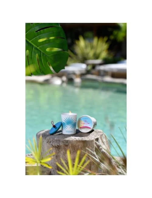 Comment utiliser ma bougie parfumée:- Avant la combustion de votre bougie, assurez-vous que la mèche soit bien droite pour que la cire puisse fondre uniformément.- Allumez votre bougie et veillez à la laisser allumée assez longtemps pour avoir un maximum de sa surface liquide.- Il est conseillé de laisser votre bougie 170g allumée de 1 à 3 heures. Pour éteindre votre bougie, trempez la mèche dans la cire à l’aide d’un petit support et redressez-la centrée avant que la cire ne se solidifie. Le Parfum:Un parfum d’évasion, résolument solaire, qui nous emmène vers des îles paradisiaques, à travers des huiles essentielles très évocatrices et enivrantes.