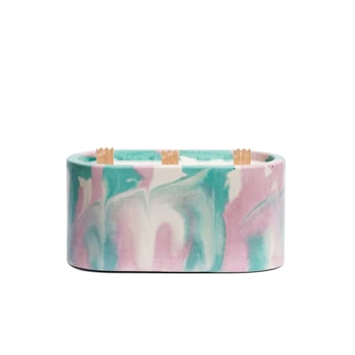 Ce bougeoir made in France est composé d’une cire de soja 100% naturelle ainsi que de trois mèches en bois, elles aussi 100% naturelles afin d’assurer une meilleure combustion de la cire. Son effet tie&dye est obtenu grâce au mélange de deux bétons colorés pour un rendu original et unique. En plus d’être singulier, ce produit contient environ 250 grammes de cire, ce qui représente plus ou moins 70 heures de combustion, pour votre plus grand plaisir !