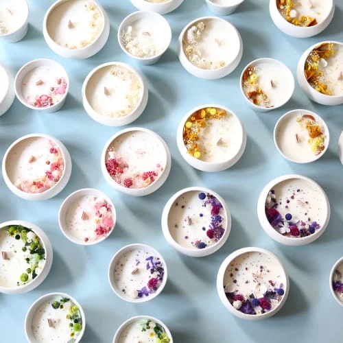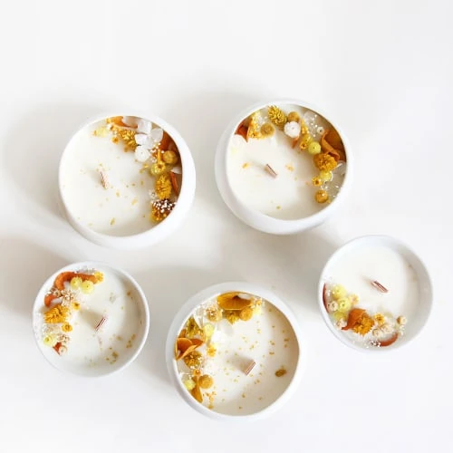 Dejolies fleurs séchéeset stabilisées viennent décorer cette composition etdonner une âme à la bougie.